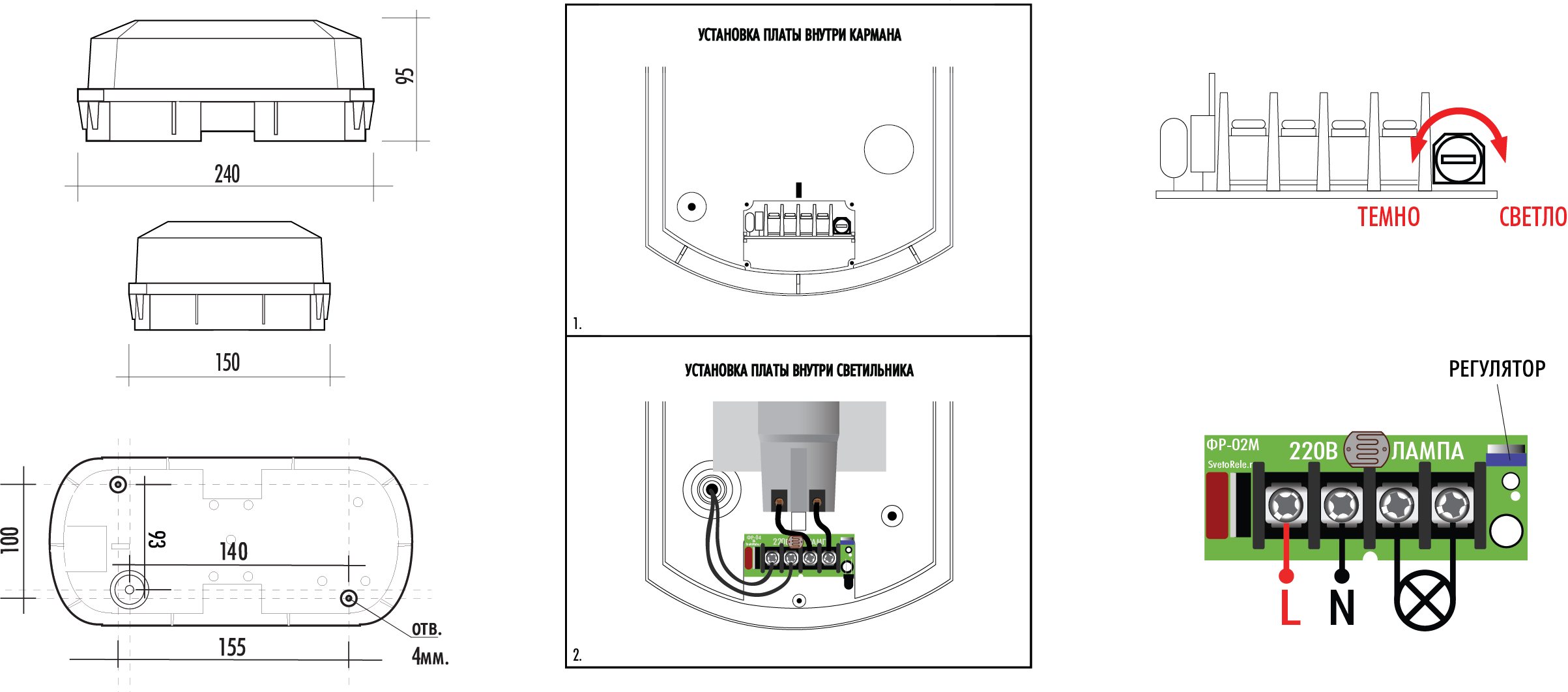 Светильник ССАВ выпускается со встроенной платой фотореле закрепленной в специальном кармане для электроники. Разберите светильник и подсоедините провода от патрона к клемме платы ФР "лампа", провод питания от сети 220 В к клемме "сеть". Вставить плату обратно, просунуть в отверстие фоторезистор - как показано на рисунке. Можно и внутри светильника закрепить плату.