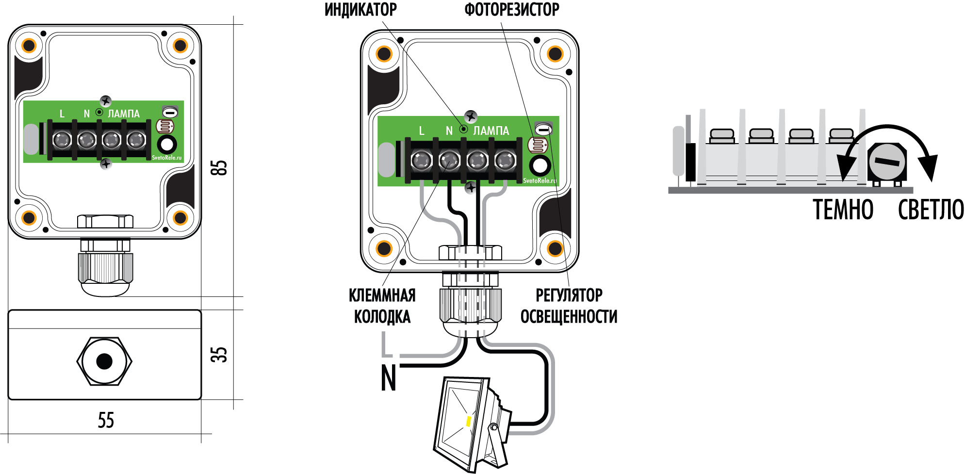 Светочувствительное реле выпускается в герметичном корпусе с присоединением проводов питания и коммутируемых электрических цепей через гермоввод.