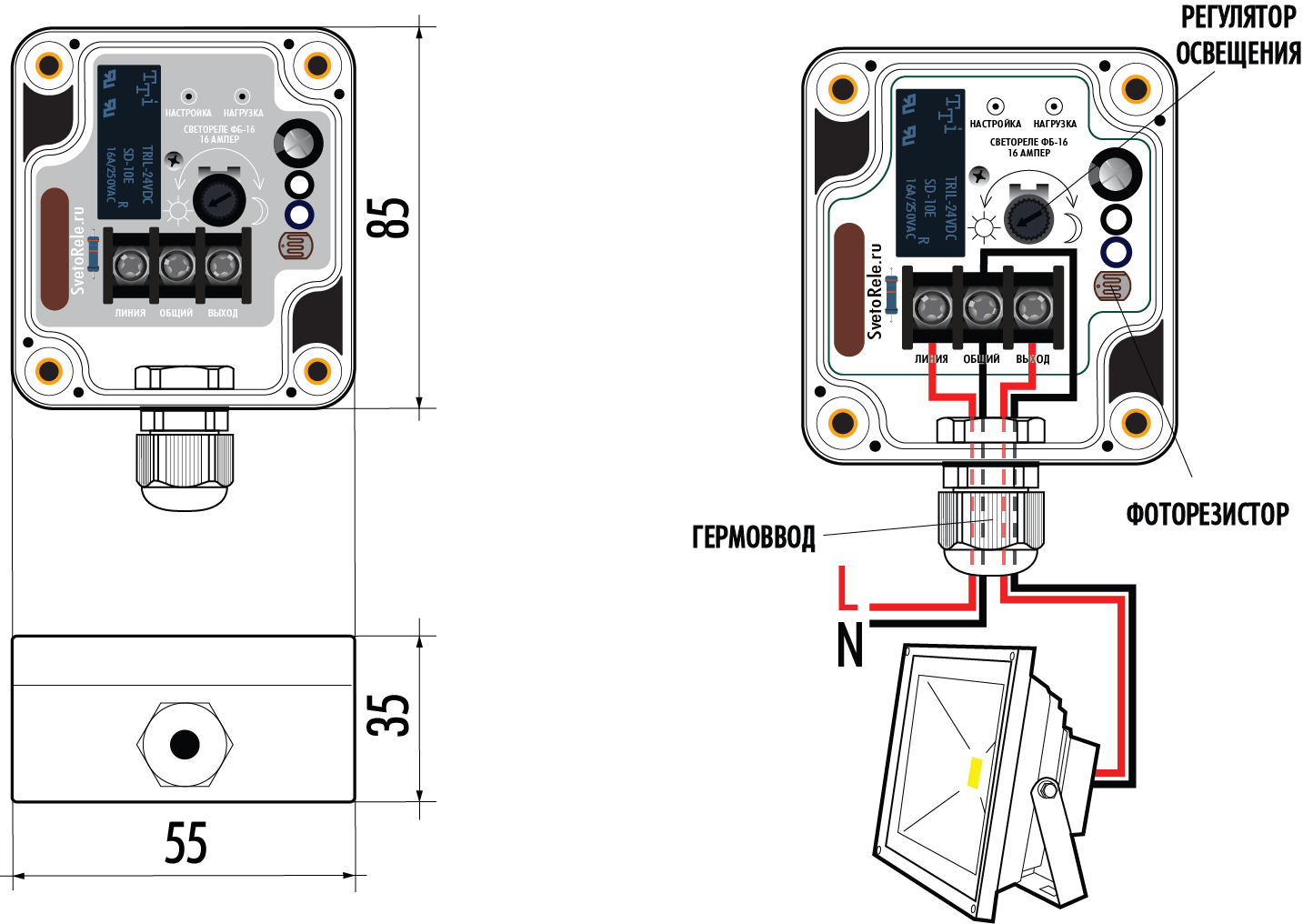 Светочувствительное реле выпускается в герметичном корпусе с присоединением проводов питания и коммутируемых электрических цепей.