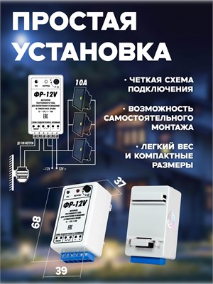Фотореле выпускается в пластиковом корпусе с присоединением проводов питания, коммутируемых электрических цепей и гермосенсора на клеммы прибора.