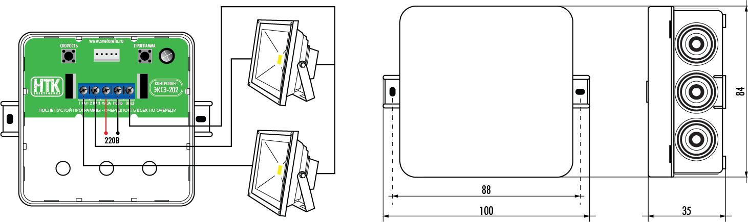 На плате прибора внутри корпуса расположены кнопки управления режимом работы, скоростью движения и клеммы для подключения нагрузки и питания. (скорость - минус яркости, программа - плюс яркости, для диммера).